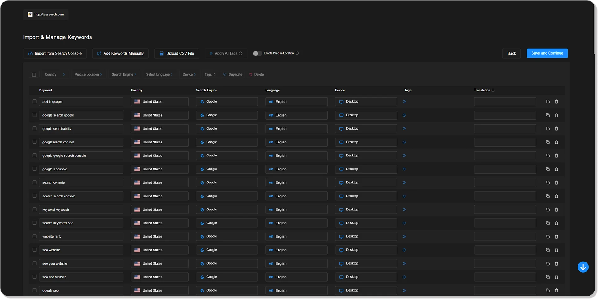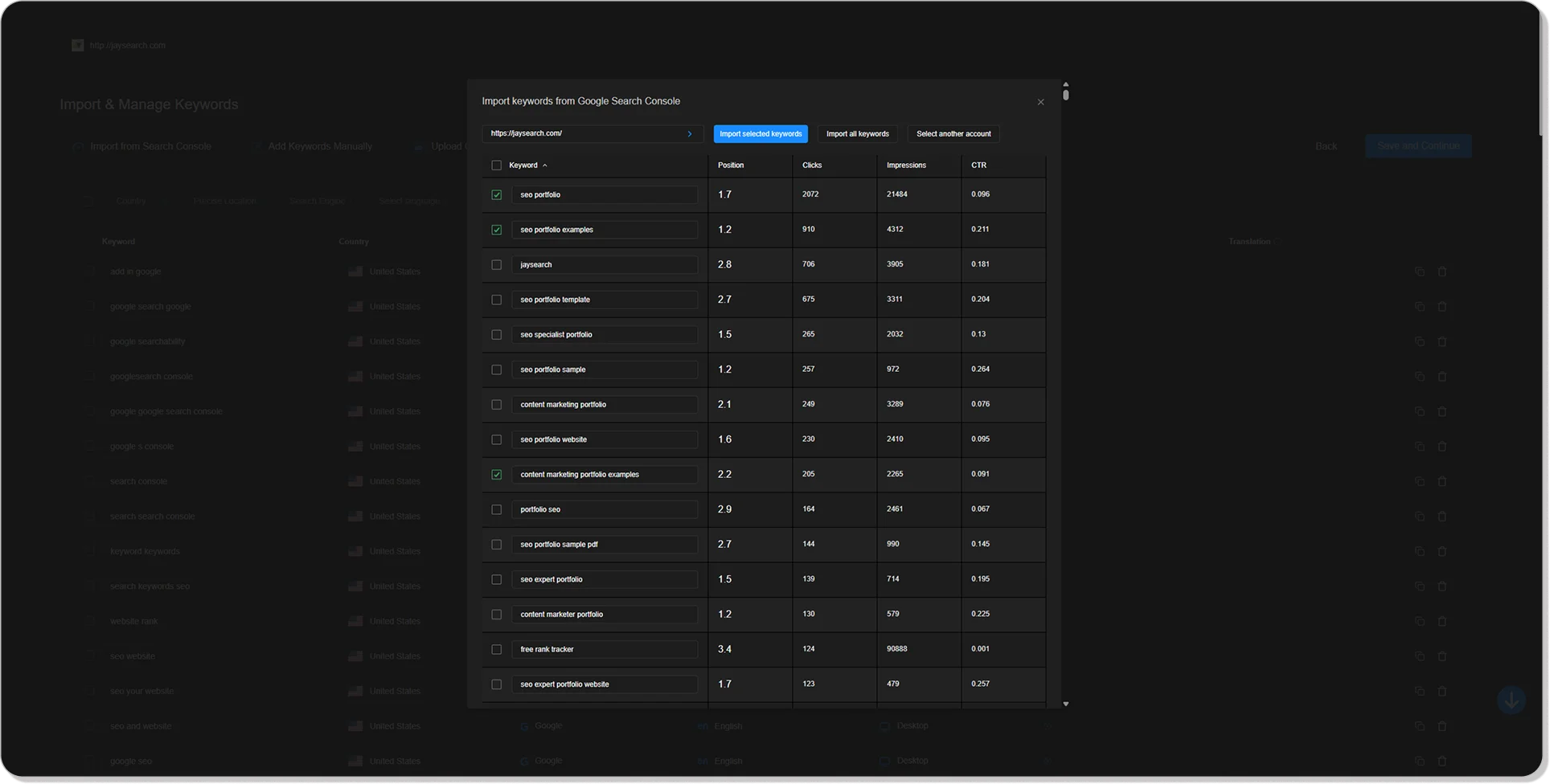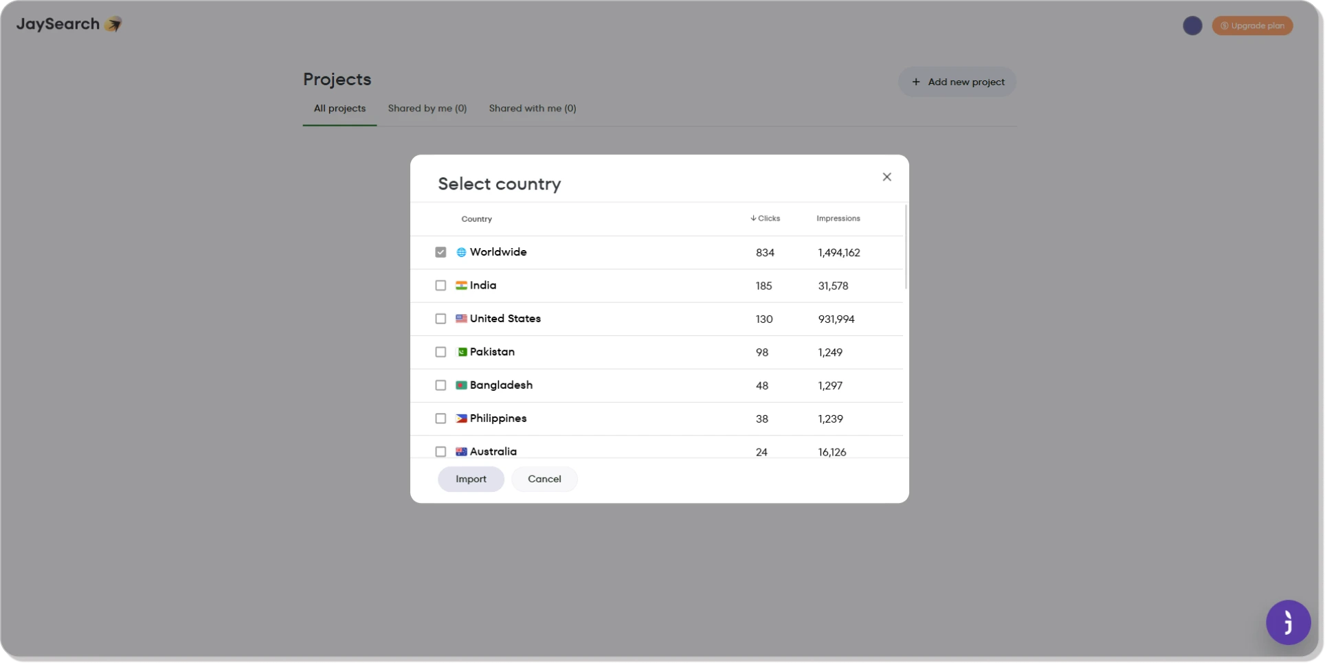 Step 2: Choose the country you want JaySearch to track your keyword rankings in, and click Import.