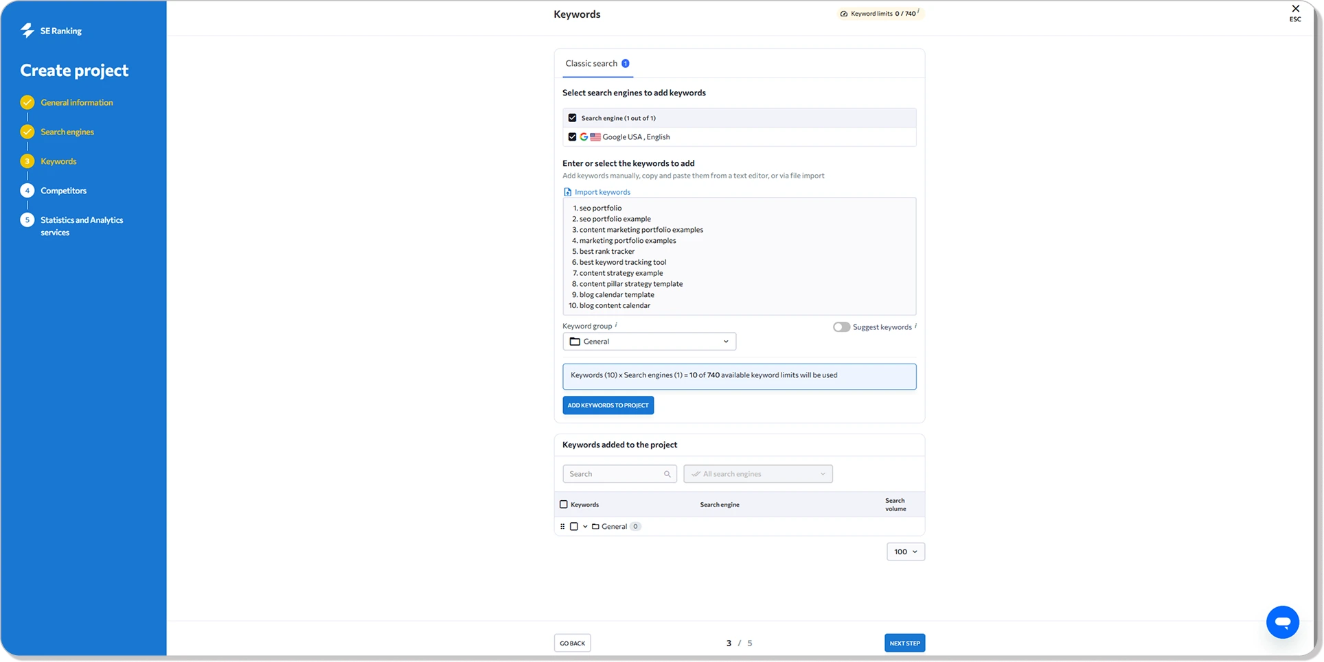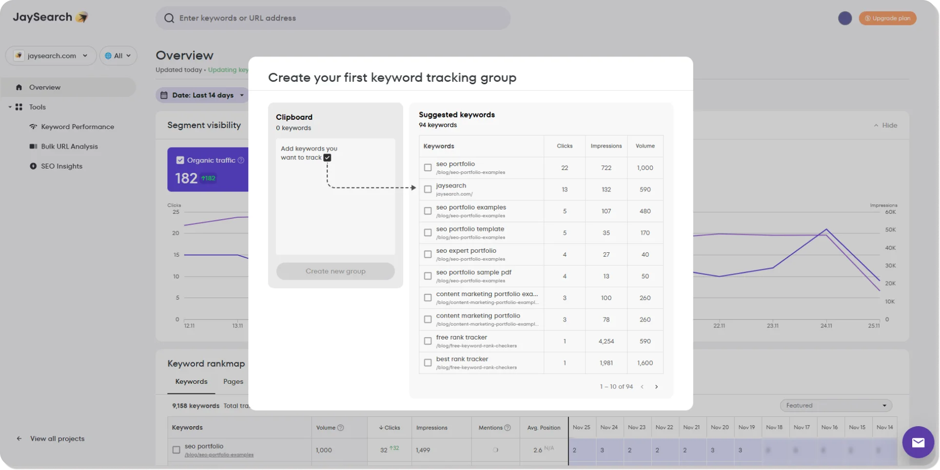 Step 3: We’re almost there. Select the keywords you’d like to track and press Create new group. Name the group in the next step and save it.