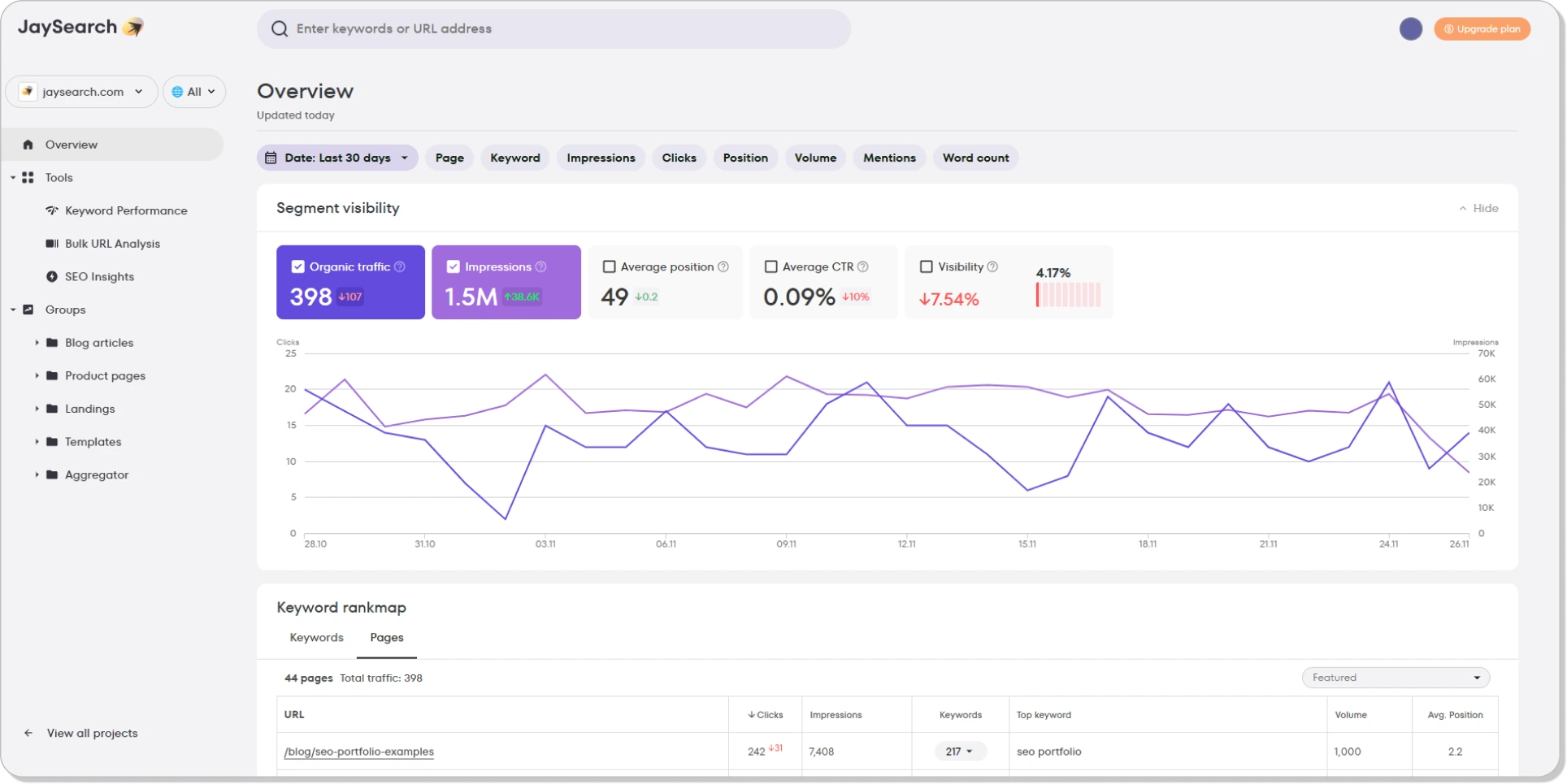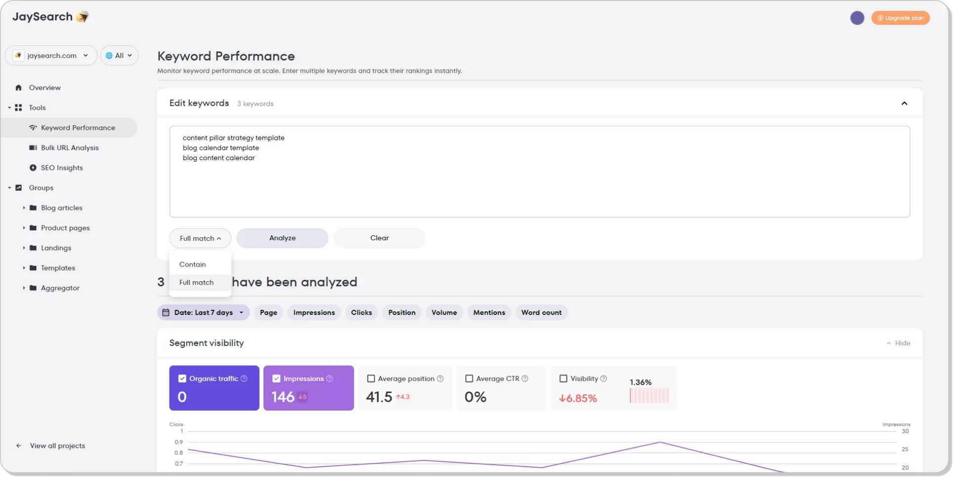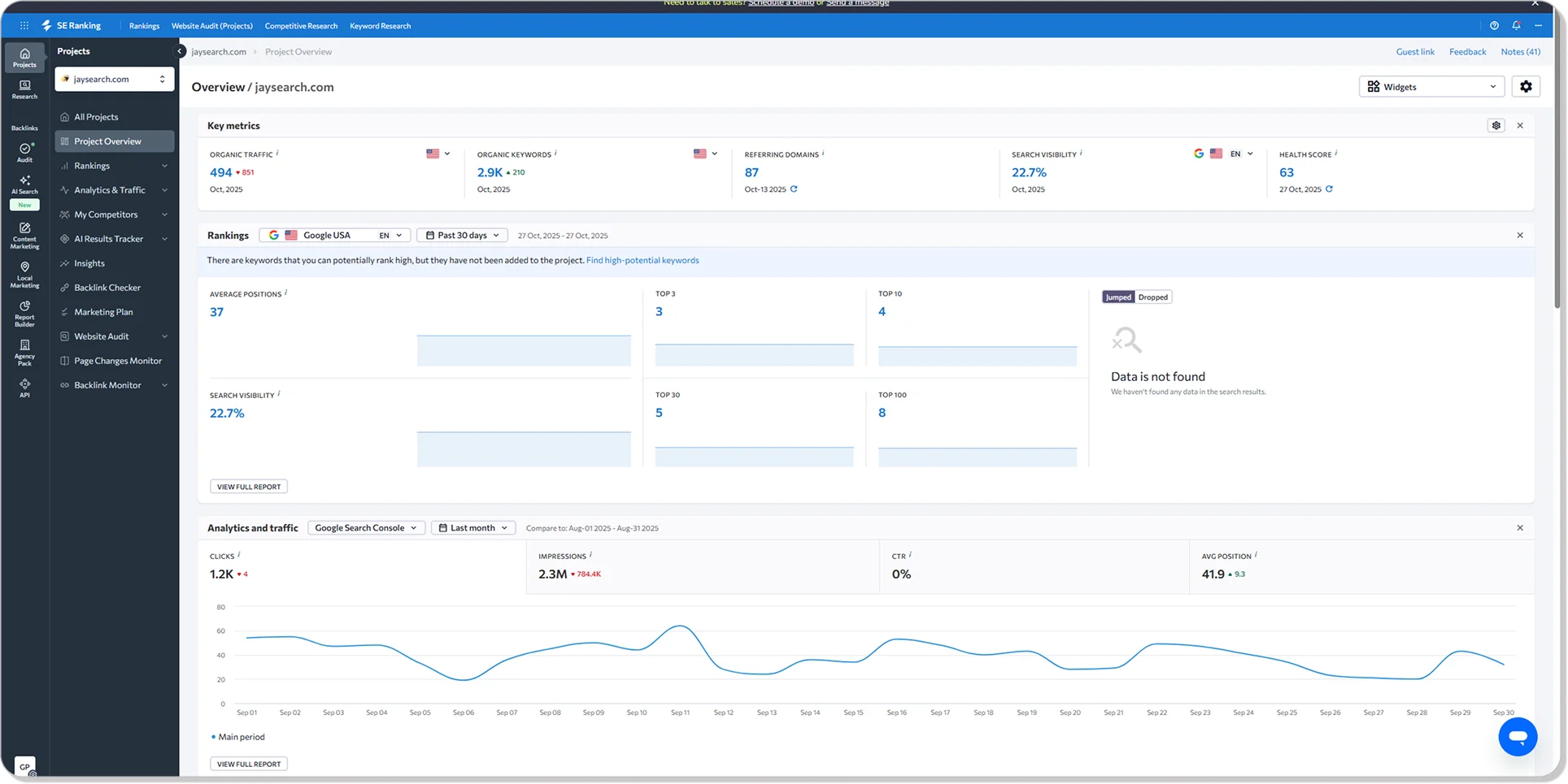 Step 4: Once your project is created, JaySearch shows you key performance metrics like traffic, impressions, average position, CTR, and visibility. JaySearch imports this information directly from Google Search Console, making it both reliable and easy to work with.