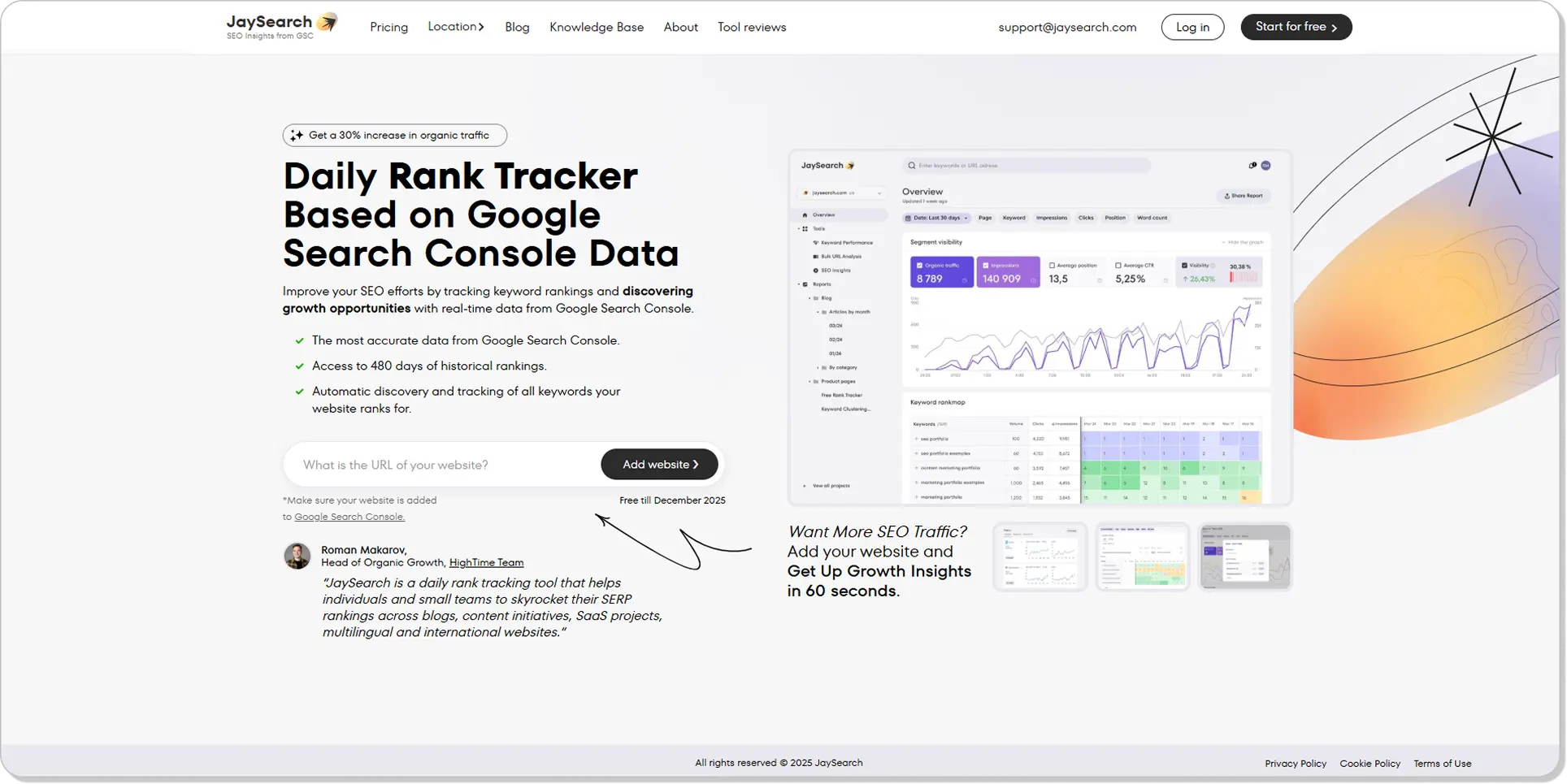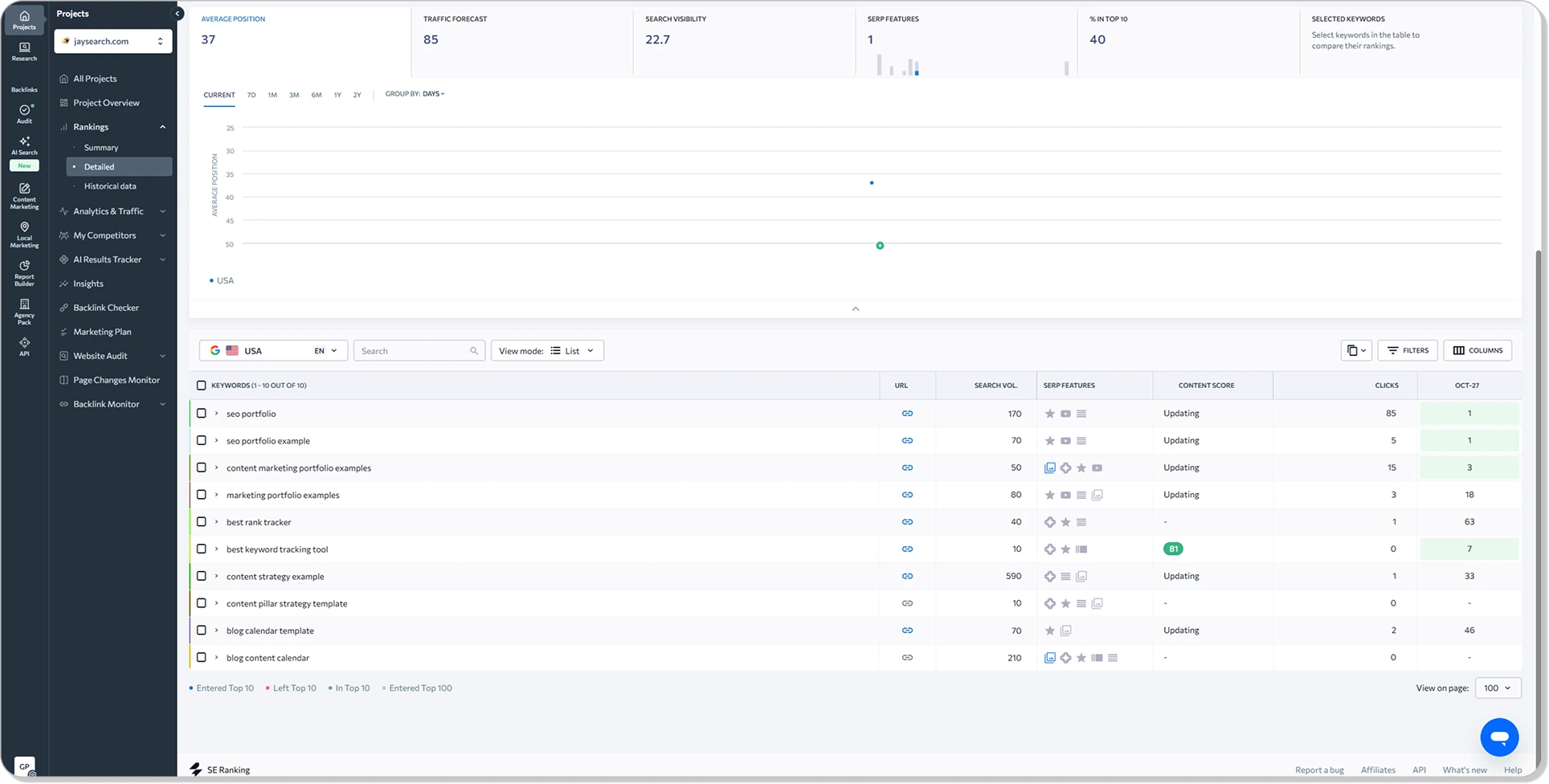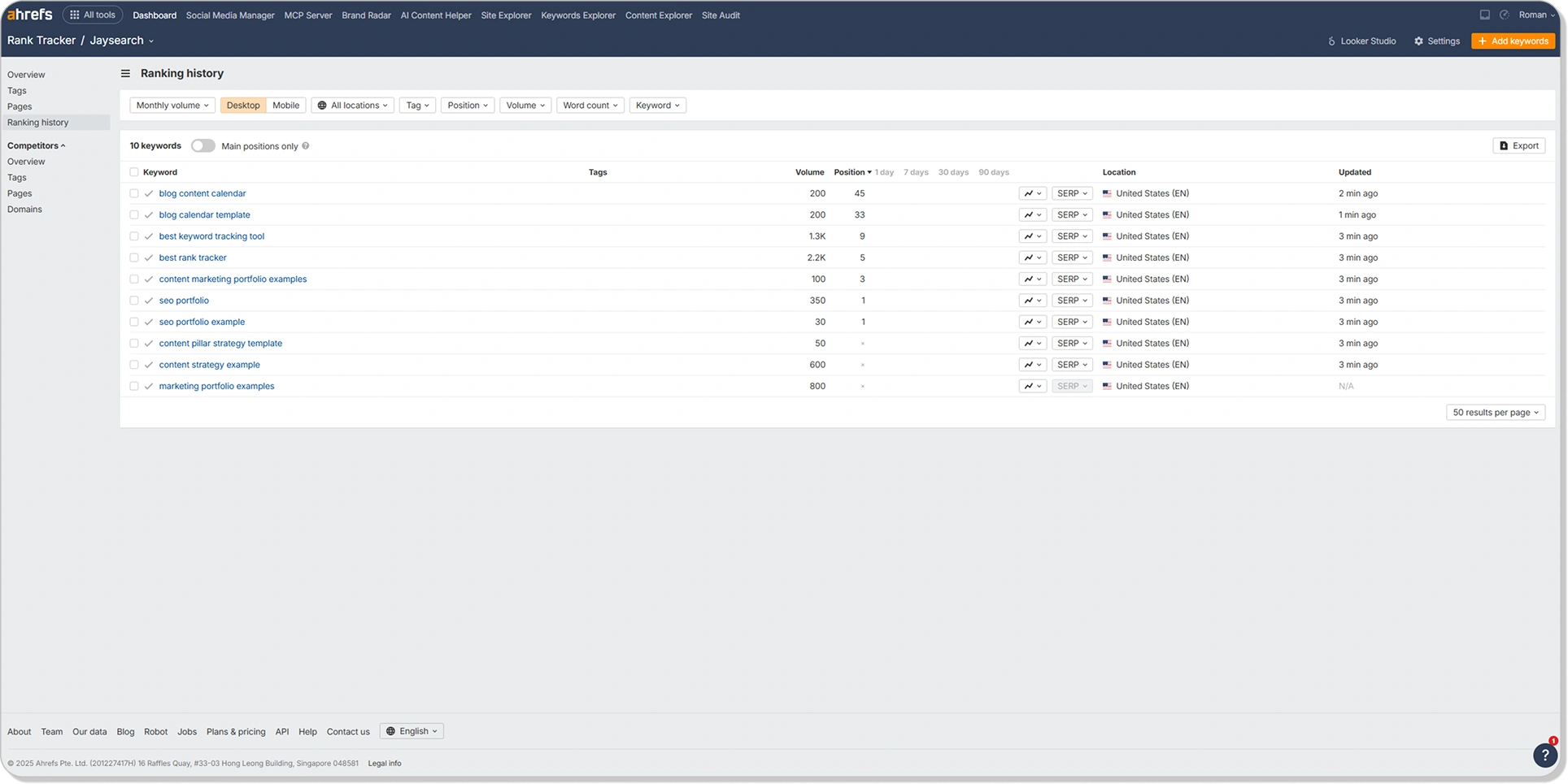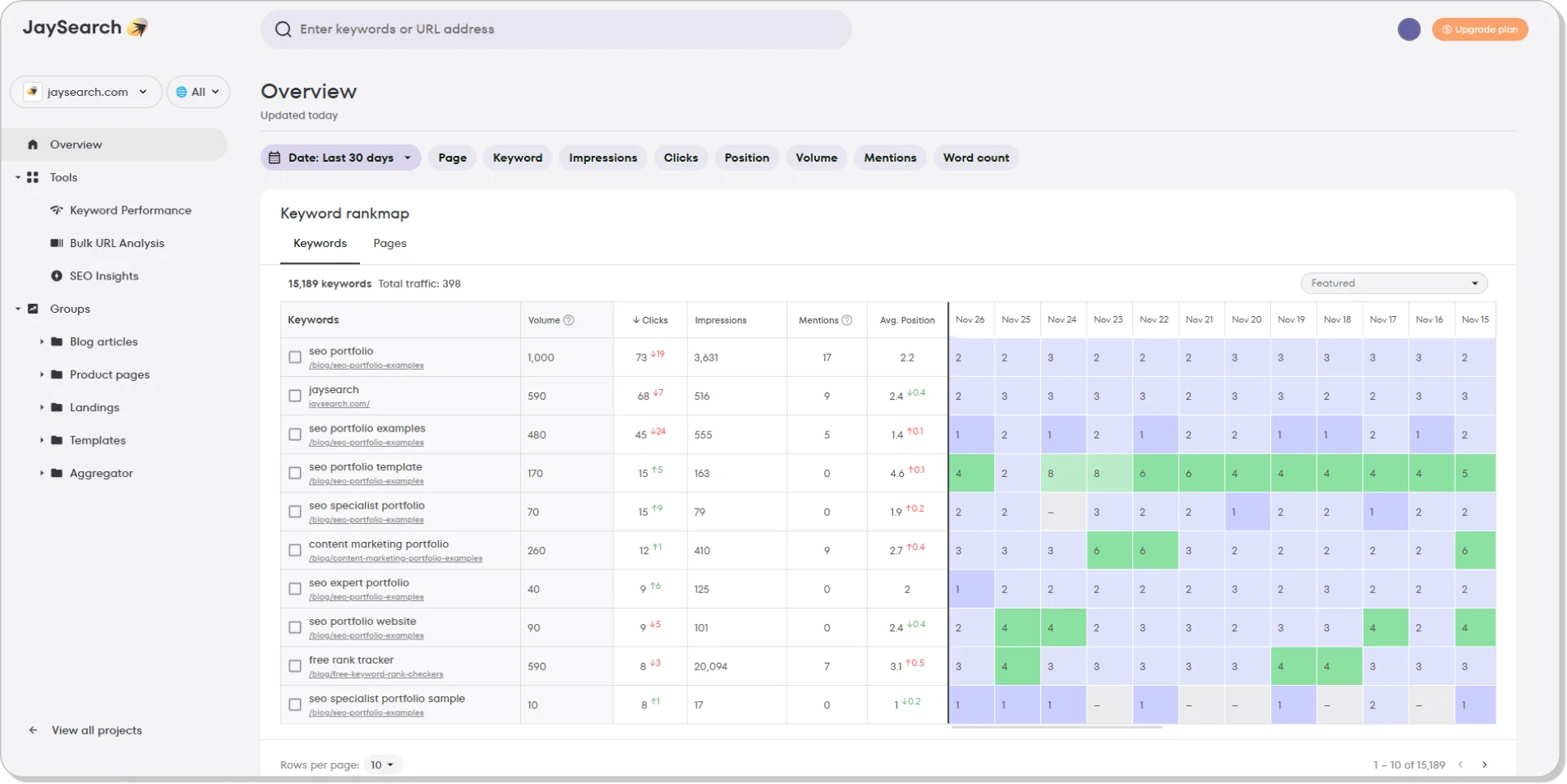 I evaluated each tool based on typical SEO specialist use cases, such as quick keyword checking, monitoring keyword positions by day, tracking and comparing positions with competitors, and grouping keywords by segment. I also considered the service’s usability, KW checking speed, and consistency with Google Search Console data for my site. Specifically, I looked at how the positions of jayserch.com keywords coincided with GSC data.
