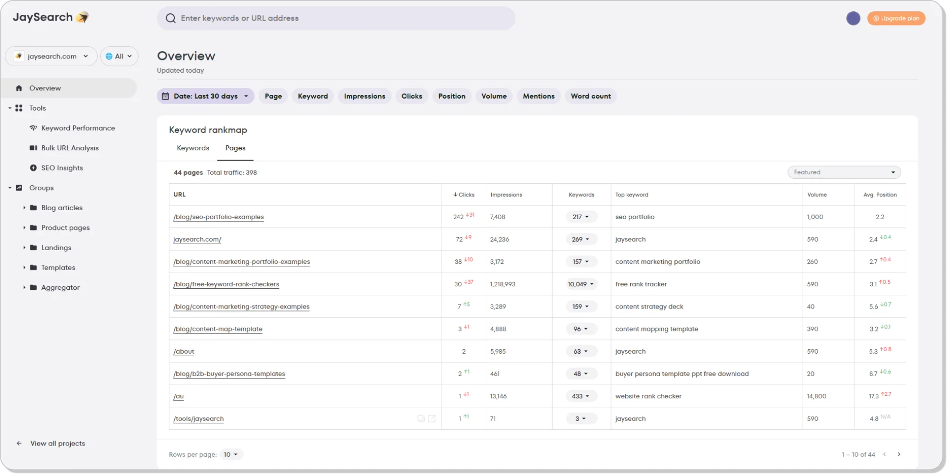 In the Pages tab, you’ll find a full list of your site’s pages along with key metrics: URLs, clicks, impressions, number of ranking keywords, its top-performing keyword and its volume, and the average position the page holds.