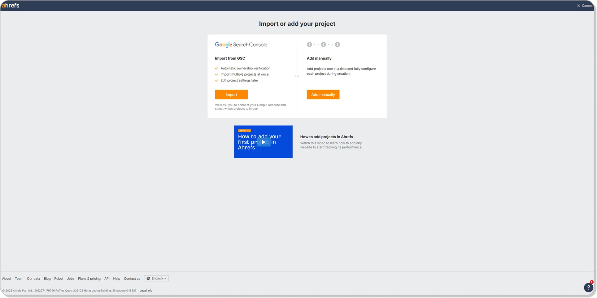 Step 1: After activating your Ahrefs account, the first thing you may want to do is add a project. You’ve got two ways to go: import data directly from Google Search Console or add a project manually.