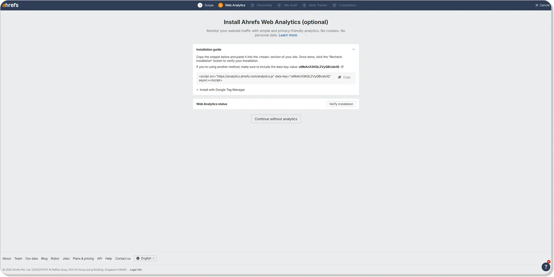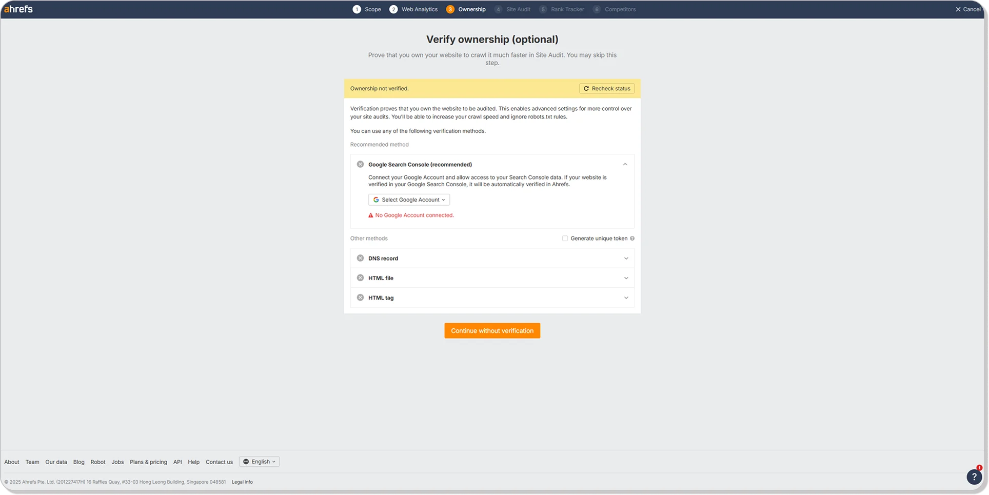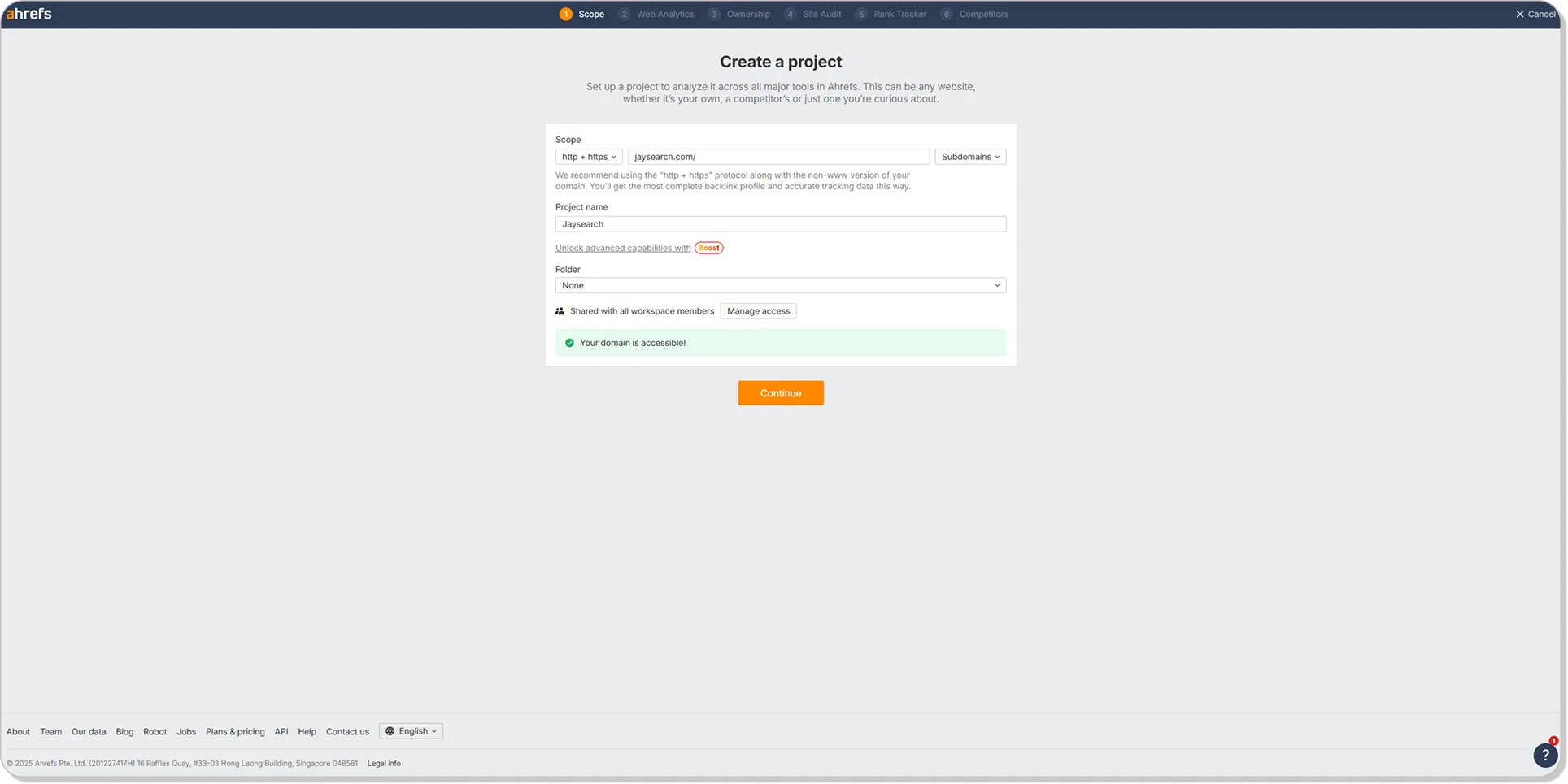 Step 2: In this step, define the scope of your project to tell Ahrefs which part of your website you need to track. Enter your site’s URL and decide whether you want to analyze the entire domain, a specific subdomain, or just one section of your site.