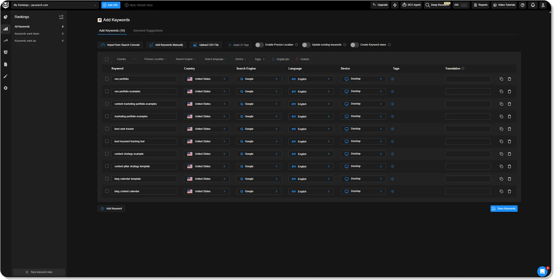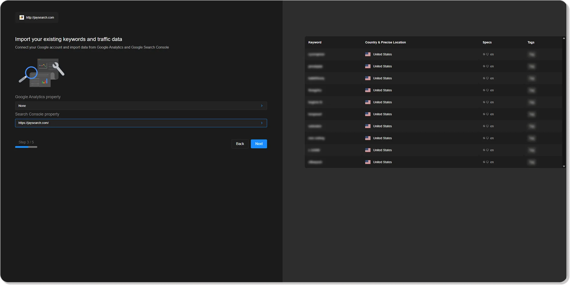 Jaysearch was built with efficiency in mind, removing the unnecessary steps that slow down many ranking tools. While some SEO platforms require hours to collect pages, select keywords to track, and configure a project, JaySearch lets you set up a fully functional project in just a few minutes. Its clear interface ensures that SEOs can instantly begin analyzing positions and monitoring keywords. Let’s go through its key functionality step by step.